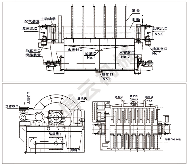 盤式真空過濾機由各個單獨的扇形片的圓盤構(gòu)成。每一個扇形片為單獨的過濾單元,由濾布做成布套在扇形片上形成濾室。過濾盤由電機通過減速器及開式齒輪傳動來驅(qū)動,過濾盤順時針方向轉(zhuǎn)動,濾室里的礦漿在吸附區(qū)借助于真空泵在過濾介質(zhì)兩側(cè)形成的壓力差,附著在過濾盤上形成濾餅后,攪拌器旋轉(zhuǎn)防止固體沉淀,濾餅離開液面后,在真空作用下繼續(xù)脫去水分。濾液透過濾布,經(jīng)過濾液管,從分配頭排出。濾餅在卸料區(qū)由反吹風(fēng)卸料落入排料槽,整個作業(yè)過程連續(xù)循環(huán)進行。